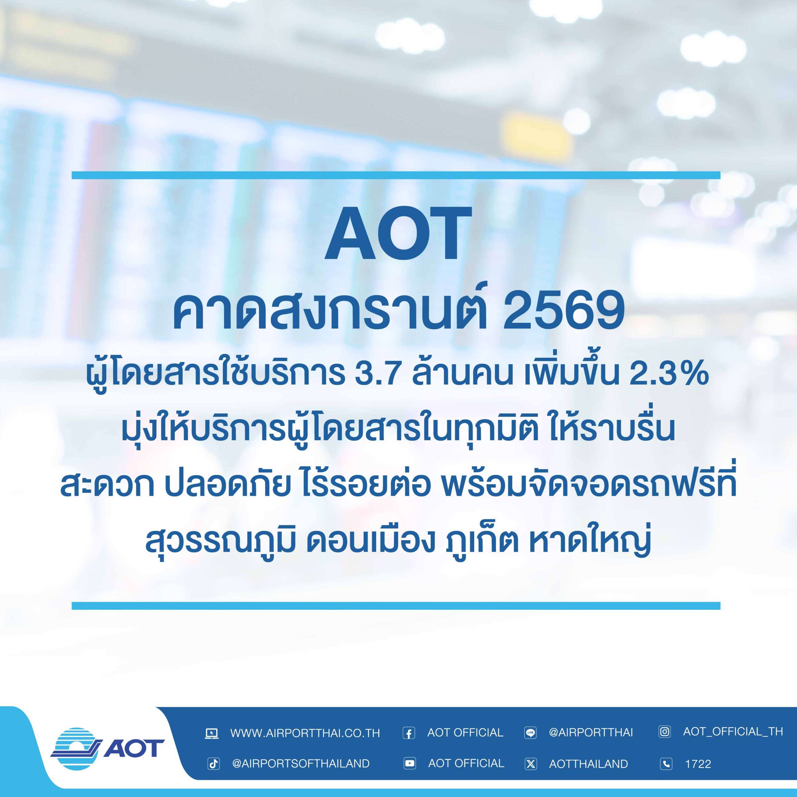 บริษัท ท่าอากาศยานไทย จำกัด (มหาชน) (AOT) คาดการณ์ปริมาณการจราจรทางอากาศช่วงเทศกาลสงกรานต์ 2569 ระหว่างวันที่ 10 – 19 เมษายน 2569 มีผู้โดยสารรวม 3.7 ล้านคน เพิ่มขึ้น 2.3% พร้อมทั้งจัดที่จอดรถฟรี ณ ท่าอากาศยานสุวรรณภูมิ ดอนเมือง ภูเก็ต และหาดใหญ่