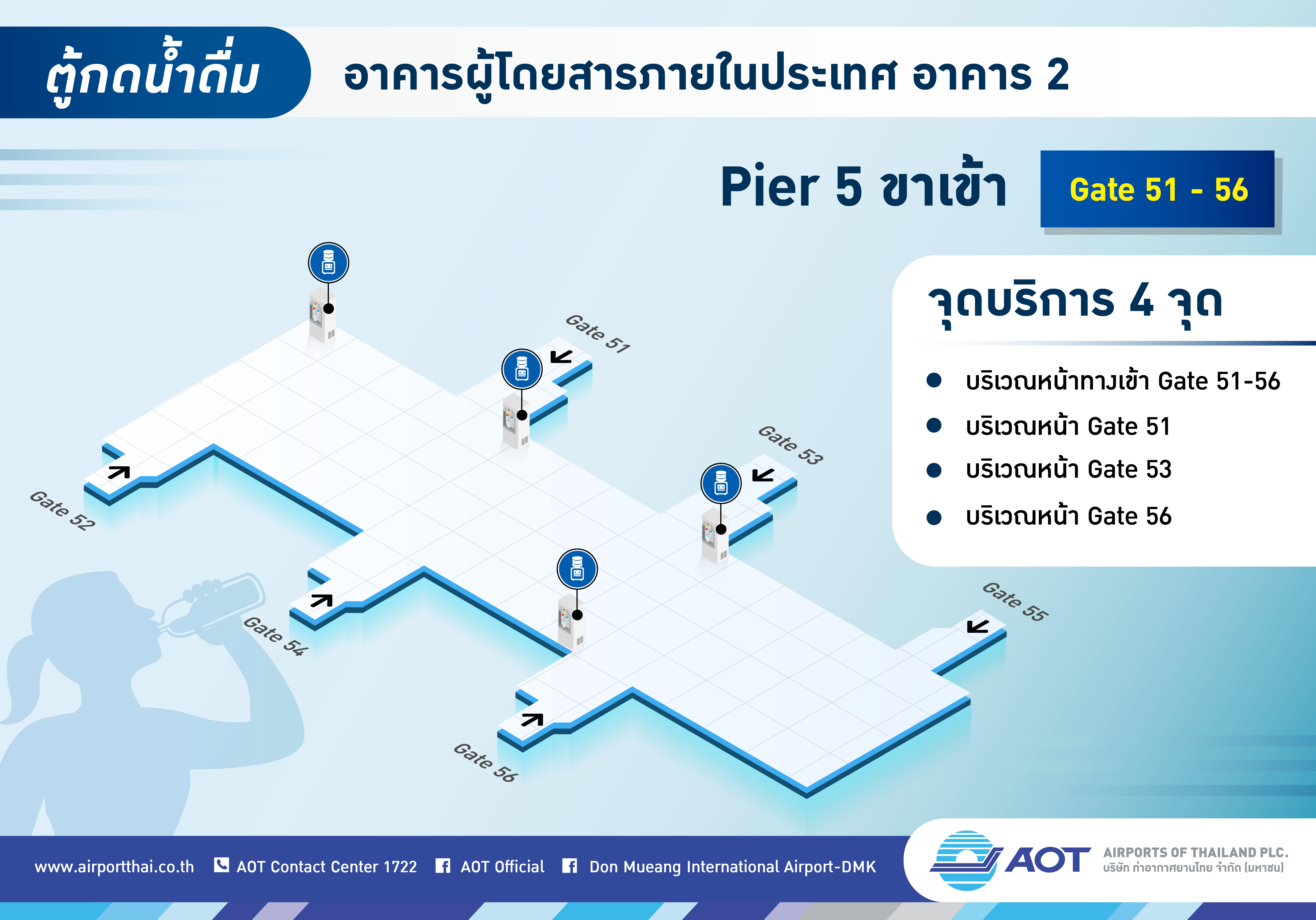 โซน Gate 51-56 Pier 5 (ขาเข้า) จัดเต็มกับ 4 จุด ตู้กดน้ำดื่ม บริการฟรี ตั้งแต่ เดินออกจากเครื่องบิน จนถึงทางลงไปสายพานรับกระเป๋า (ชั้น 1)