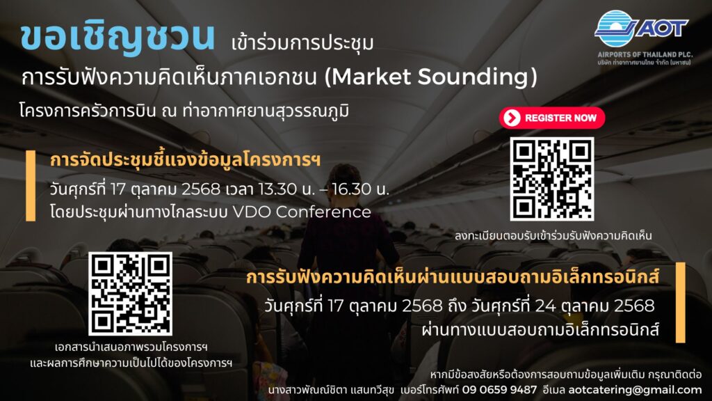 ขอเชิญชวนเข้าร่วมการประชุมการรับฟังความคิดเห็นภาคเอกชน (Market Sounding) โครงการครัวการบิน ณ ท่าอากาศยานสุวรรณภูมิ